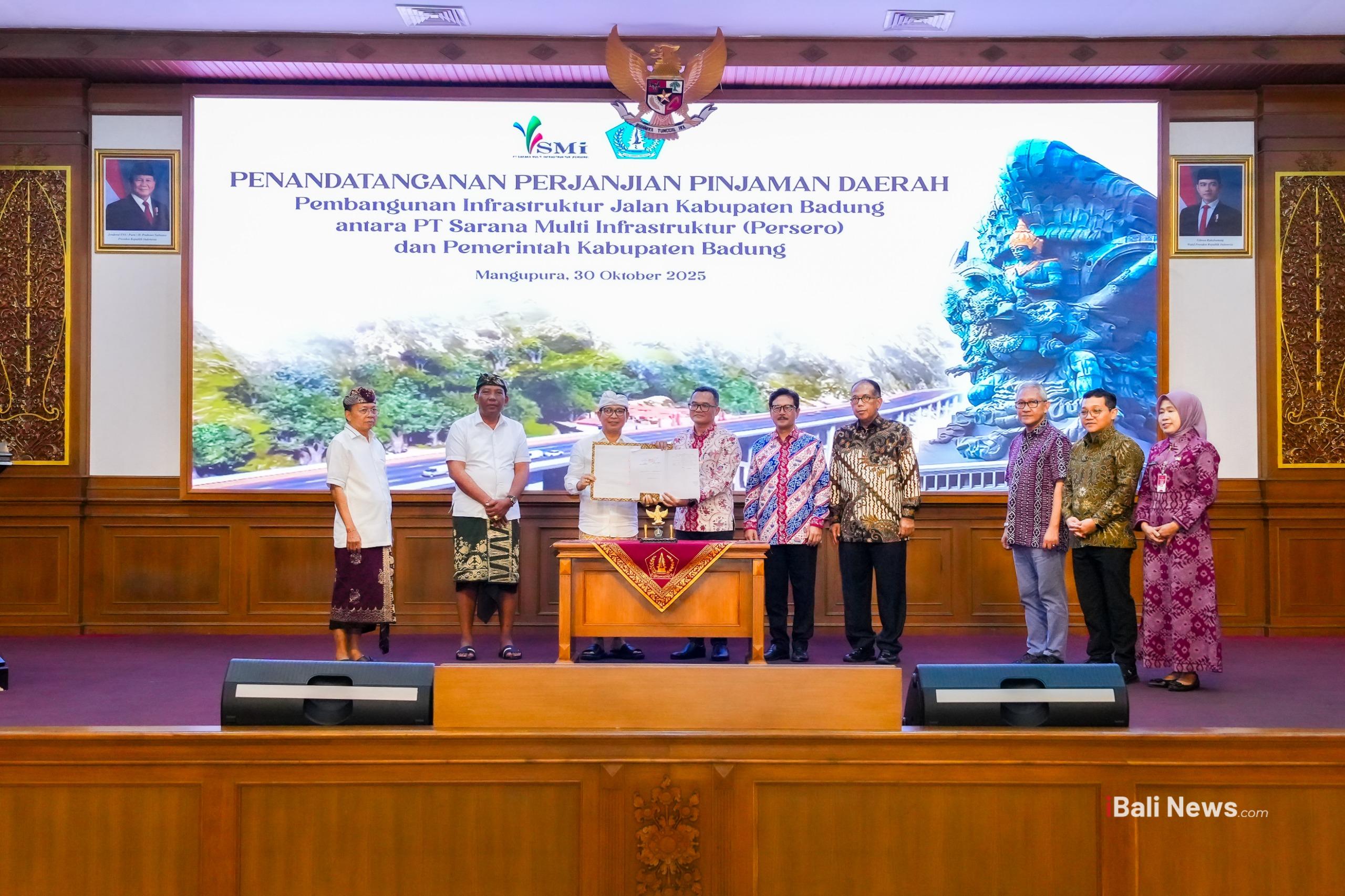 BADUNG, iBaliNews.Com – Untuk akselerasi pembangunan infrastruktur jalan guna mengurai kemacetan di kawasan Kuta Selatan dan Kuta Utara, Bupati Badung I Wayan Adi Arnawa didampingi Ketua DPRD Badung I Gusti Anom Gumanti menandatangani Perjanjian Pinjaman Daerah Pembangunan Infrastruktur Jalan Kabupaten Badung antara PT. Sarana Multi Infrastruktur (SMI) (Persero) dengan Pemkab Badung, bertempat di Ruang Kertha Gosana, Puspem Badung, Kamis (30/10/2025).