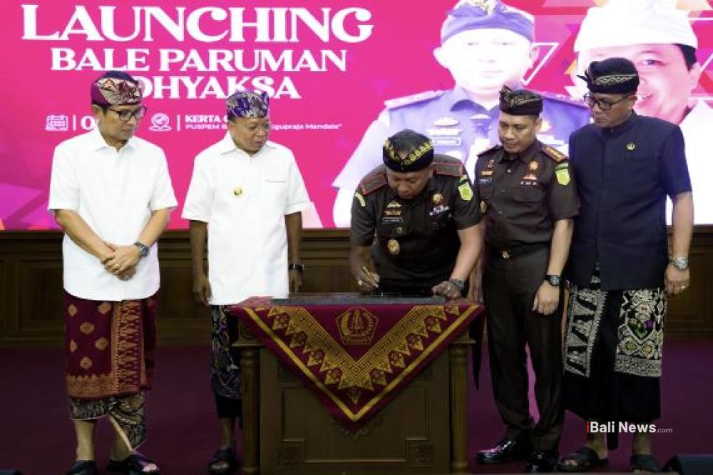 MANGUPURA, iBaliNews.Com – Kepala Kejaksaan Tinggi Bali Ketut Sumedana bersama Gubernur Bali Wayan Koster dan Bupati Badung I Wayan Adi Arnawa meresmikan Bale Paruman Adhyaksa se-Kabupaten Badung yang ditandai dengan penandatanganan prasasti, di Ruang Kertha Gosana, Puspem Badung, Kamis (08/05/2025). Bale Paruman Adhyaksa adalah tempat dimana masyarakat desa maupun masyarakat Desa Adat menyelesaikan permasalahan-permasalahan hukum dengan menempuh jalur perdamaian.