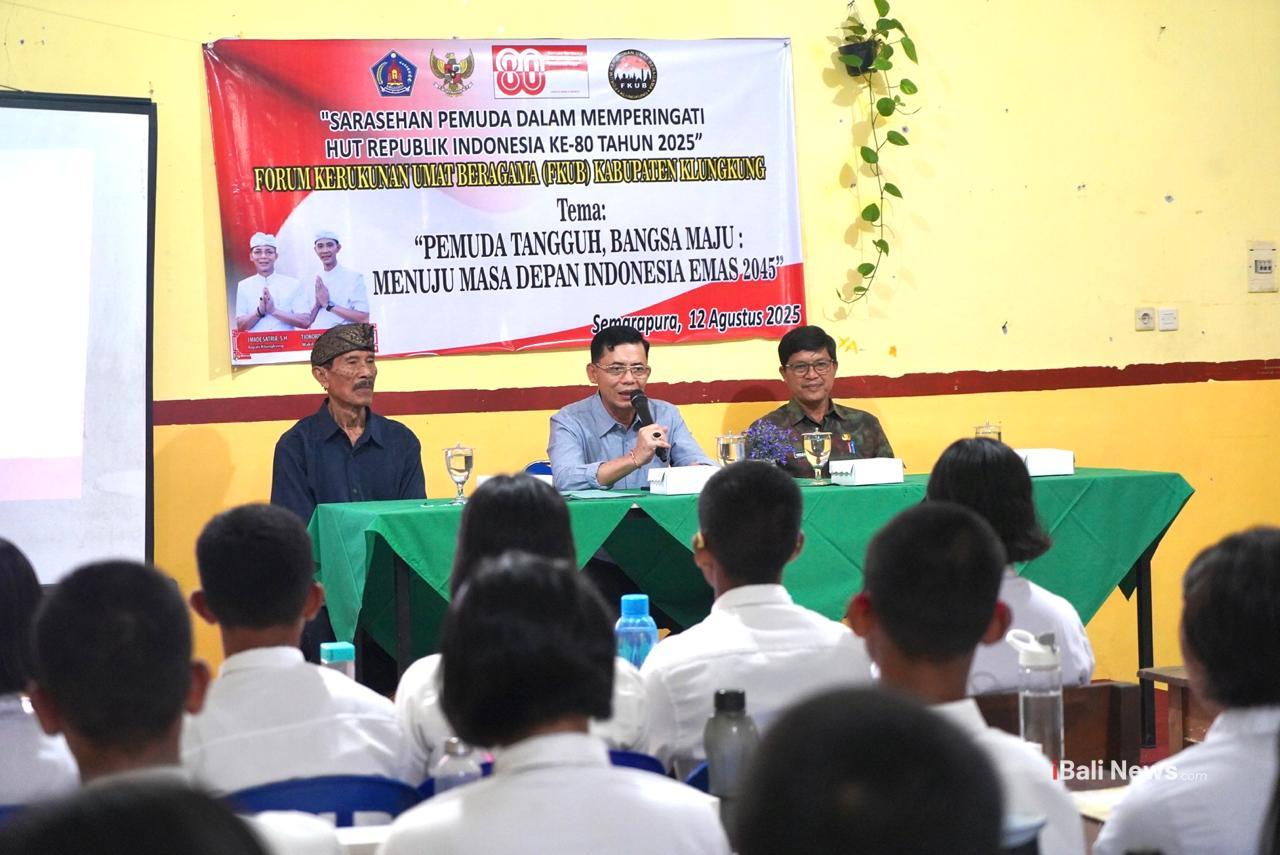 KLUNGKUNG, iBaliNews.Com – Menjelang Peringatan HUT Kemerdekaan Republik Indonesia (RI) ke-80 dengan spirit Mahottama Bupati Klungkung, I Made Satria didampingi Kepala Kesbangpolinmas Kabupaten Klungkung, Dewa Ketut Sueta Negara memberikan Wawasan Kebangsaan kepada Calon Pengibar Bendera Pusaka (Capaska) di SMP Negeri 2 Banjarangkan, di Dusun Pau Desa Tihingan, Kecamatan Banjarangkan, Kabupaten Klungkung, Selasa (12/8).