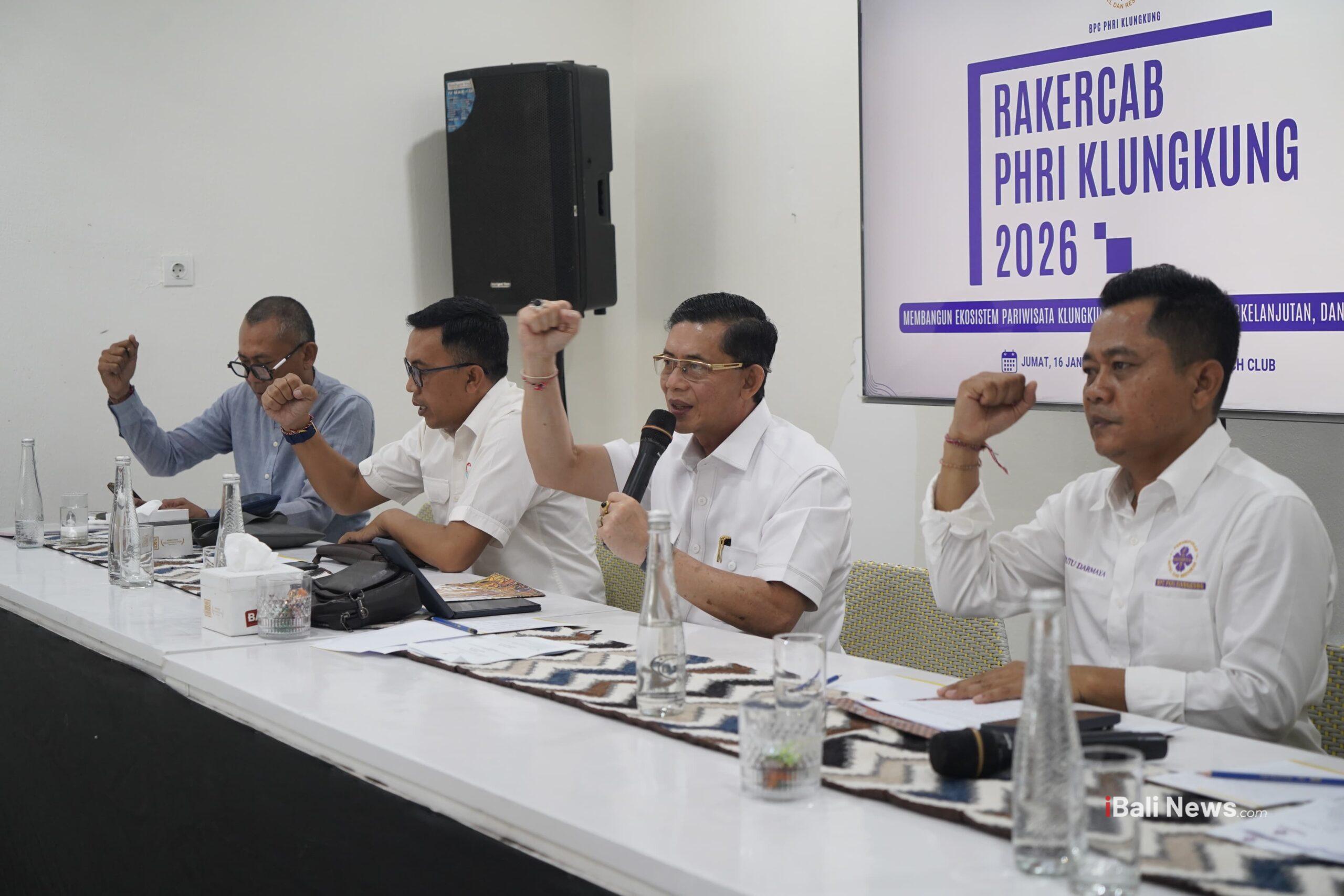 NUSA PENIDA, iBaliNews.Com – Bupati Klungkung I Made Satria secara resmi membuka kegiatan Rapat Kerja Cabang (Rakercab) Perhimpunan Hotel dan Restoran Indonesia (PHRI) Klungkung ke-II Tahun 2026, bertempat di Caspla Beach Club, Nusa Penida, Jumat (16/1). Kegiatan ini diselenggarakan sebagai upaya membangun komitmen bersama seluruh anggota PHRI Klungkung untuk berperan aktif dan kolaboratif dalam membangun ekosistem pariwisata Klungkung yang berdaya saing, inklusif, dan berkelanjutan.