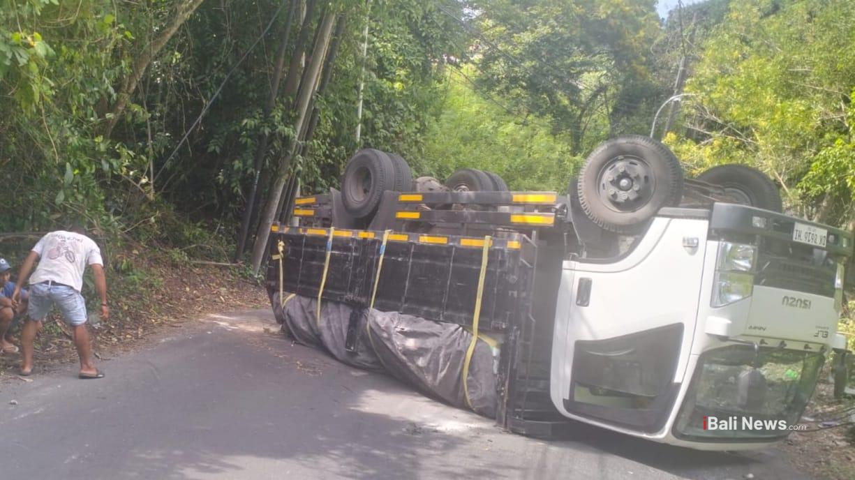 Truk yang hendak mengantar semen menuju Uluwatu itu gagal menanjak dan akhirnya terguling, menyebabkan muatan tumpah hingga menutup sebagian badan jalan.
