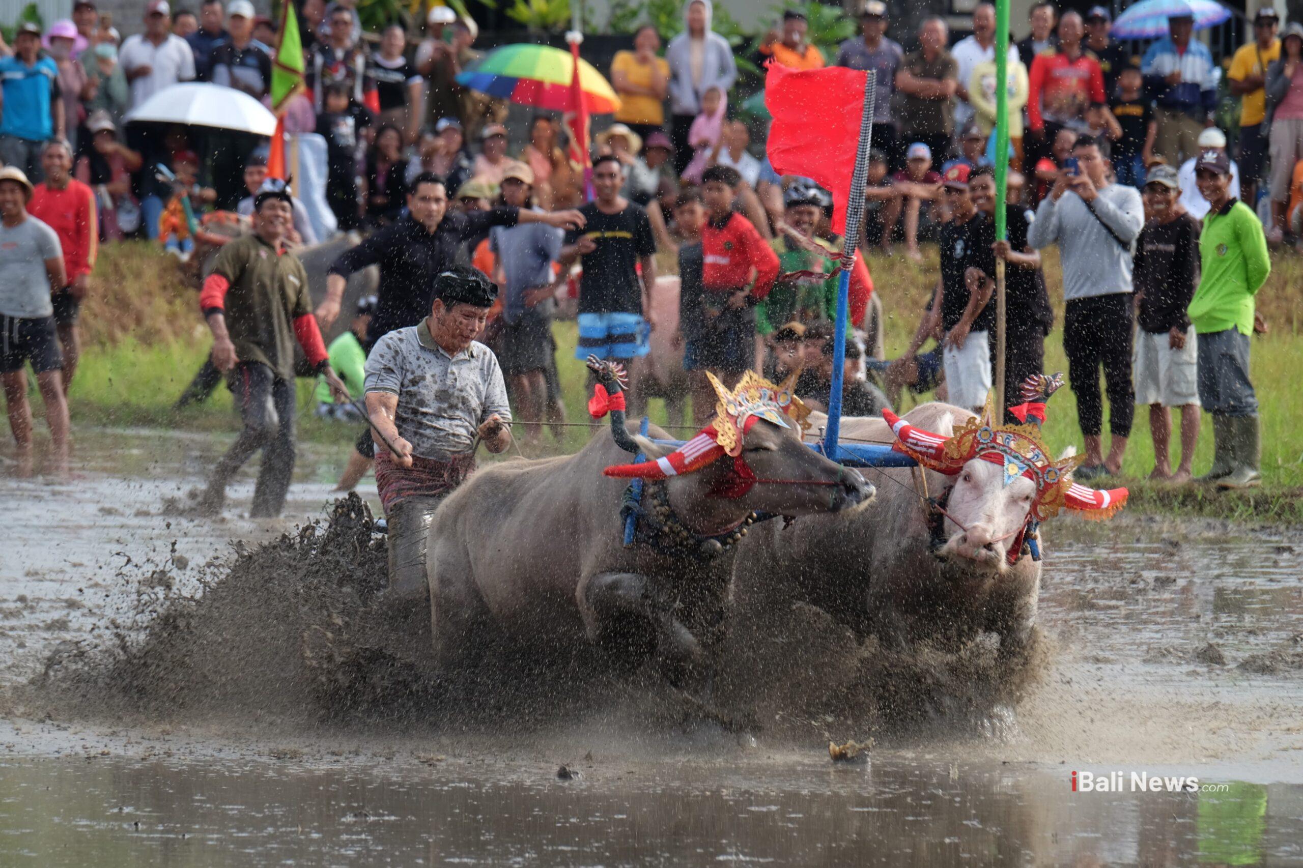 Lomba Mekepung Lampit 2025 di Subak Pecelengan diikuti oleh 38 peserta dari berbagai sekaa di wilayah Jembrana. Masyarakat tampak memadati lokasi sejak pagi, menikmati suasana sawah berlumpur yang menjadi ciri khas Mekepung Lampit.